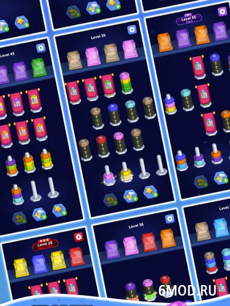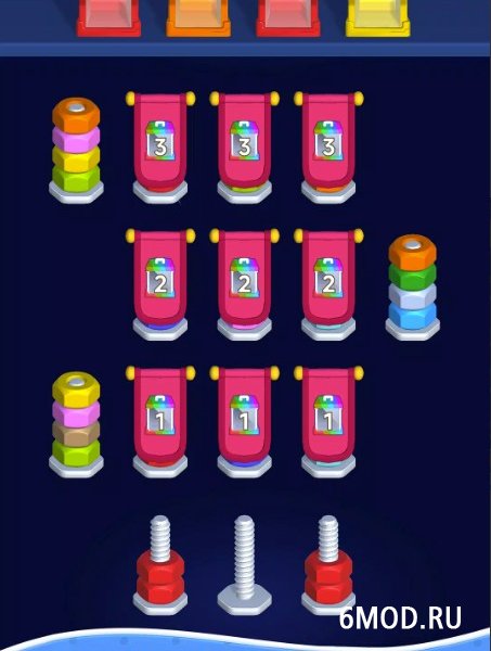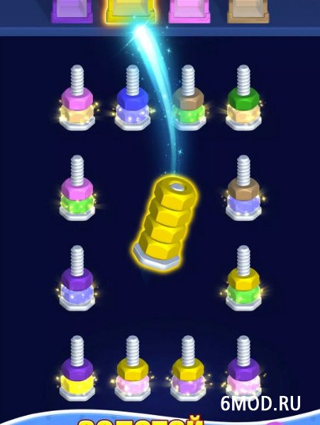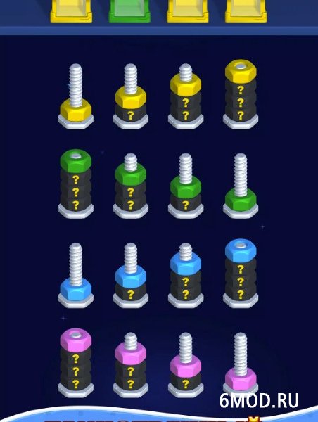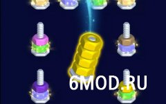 3D Nuts Sort - веселая игра на сортировку, которая бросит вызов вашему уму и логике. Она перенесет вас в мир, где кто-то перемешал цветные штыри и гайки. Наведите в нем порядок, рассортировав их по цветам и нанизав на соответствующие шпильки. Правила просты - желтые гайки необходимо нанизать на желтый штырь, красные на красный и так далее. Кроме того, за один ход можно переместить только одну гайку. На первый взгляд все предельно просто, но с каждым следующим уровнем задания усложняются, а это потребует напряжения всех ваших усилий и терпения. В общей сложности, вам предстоит преодолеть более тысячи ярких и сложных уровней. Каждая успешная сортировка - дополнительные призовые балы в вашу коллекцию. И чем дальше вы пройдете, тем больше награды получите.